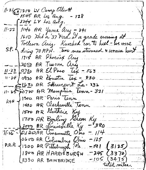 Wednesday, Nov. 21. 1945. 1200: Left Camp Elliott on a discharge Special consisting of 12 coaches and 2 Army kitchen cars in position 4 and 11, each serving 6 coaches.