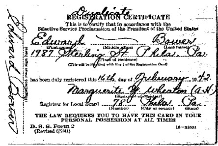 On 16 February 1942, Ed was registered for the draft, and became classified "1A" on July 31st 1942.