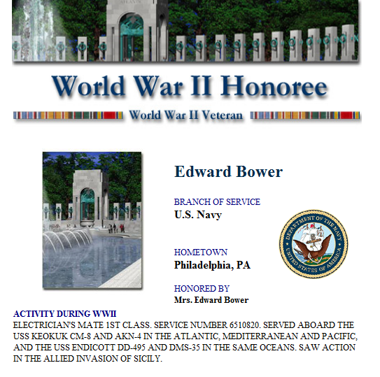 Thanks very much to Mr. Edward Bower, long time Falls Church resident and US Navy veteran, who agreed to participate in this project, and became the first veteran interviewed and published on this website.